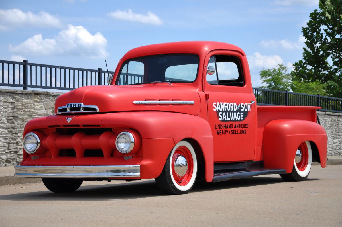 This 1951 Ford F-1 commands attention everywhere it goes. The truck is very solid with no rust, the paint is basecoat clearcoat so will hold up well. The truck has a Heidts IFS installed with tubular control arms, power steering and front disc brakes. The rear axle has been flipped and the frame C notched to give the truck a very low stance and a great ride. The engine is a 302 V8 with Mallory ignition, Wieand aluminum intake manifold, Edelbrock carburator and headers. The truck has a V-belt aluminum pulley setup with an aftermarket power steering pump. The transmission is a 94-96 Mustang T5 with a new clutch and hardware. The rear axle is a 9 inch with 3:50 gearing. With this setup the truck runs and rides comfortably at 70 mph with ease. The pickup was also fitted with new Wheel Vintiques smoothy wheels and Coker WWW radials. During the build the truck was treated to a new wiring harness from front to rear to make it dependable for daily driving. The bed floor is distressed looking with a fresh coat of poly anf the new fuel tank is located under the bed. On the inside the red bucket seat interior is very nice, the seats are very nice with no damage as it the new carpeting. The headliner is black cloth and the kick panels are new. The dash had a fresh repaint and houses new Dolphin gauges made for these F100 trucks. All the lights and gauges are in working order, the truck does have heat and an AM/FM radio. The wipers are inoperable...rainex does the trick. A GM tilt column was also added along with a custom leather wrapped steering wheel and a custom shifter. The trucks logos are painted on just like the truck in the TV show.... Fred would be proud!!! The truck has 235 miles put on the build and you cant beat the people off of it at a show! This one is is an absolute crowd pleaser anywhere you take it Dont miss out! These trucks are getting hard to find so call Scott at 615 476 1195 for more details. DO NOT HESITATE TO CALL... THESE TRUCKS GO FAST! Tn residents will pay all applicable tax ,tag and doc fees. All out of state buyers will pay a $124.95 doc fee and a .003% tax required by my state on all out of state sales. (about 30 bucks on 10k) TNRODS